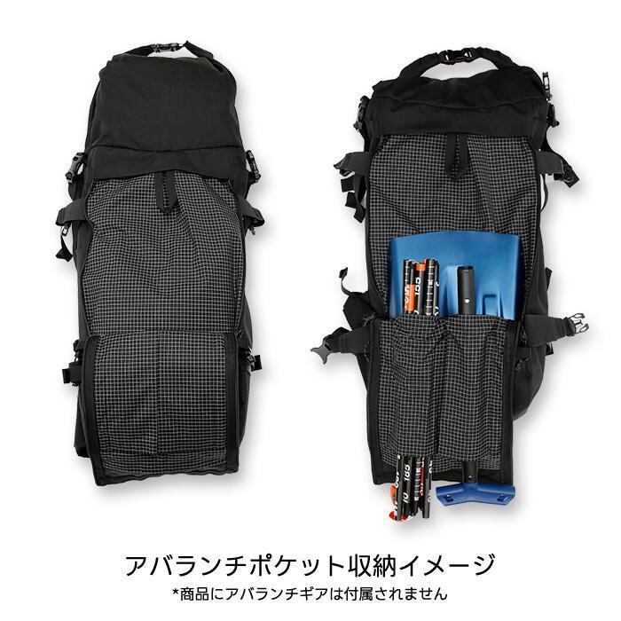 ・ポールやスキー・スプリットボードを固定できるサイドストラップ