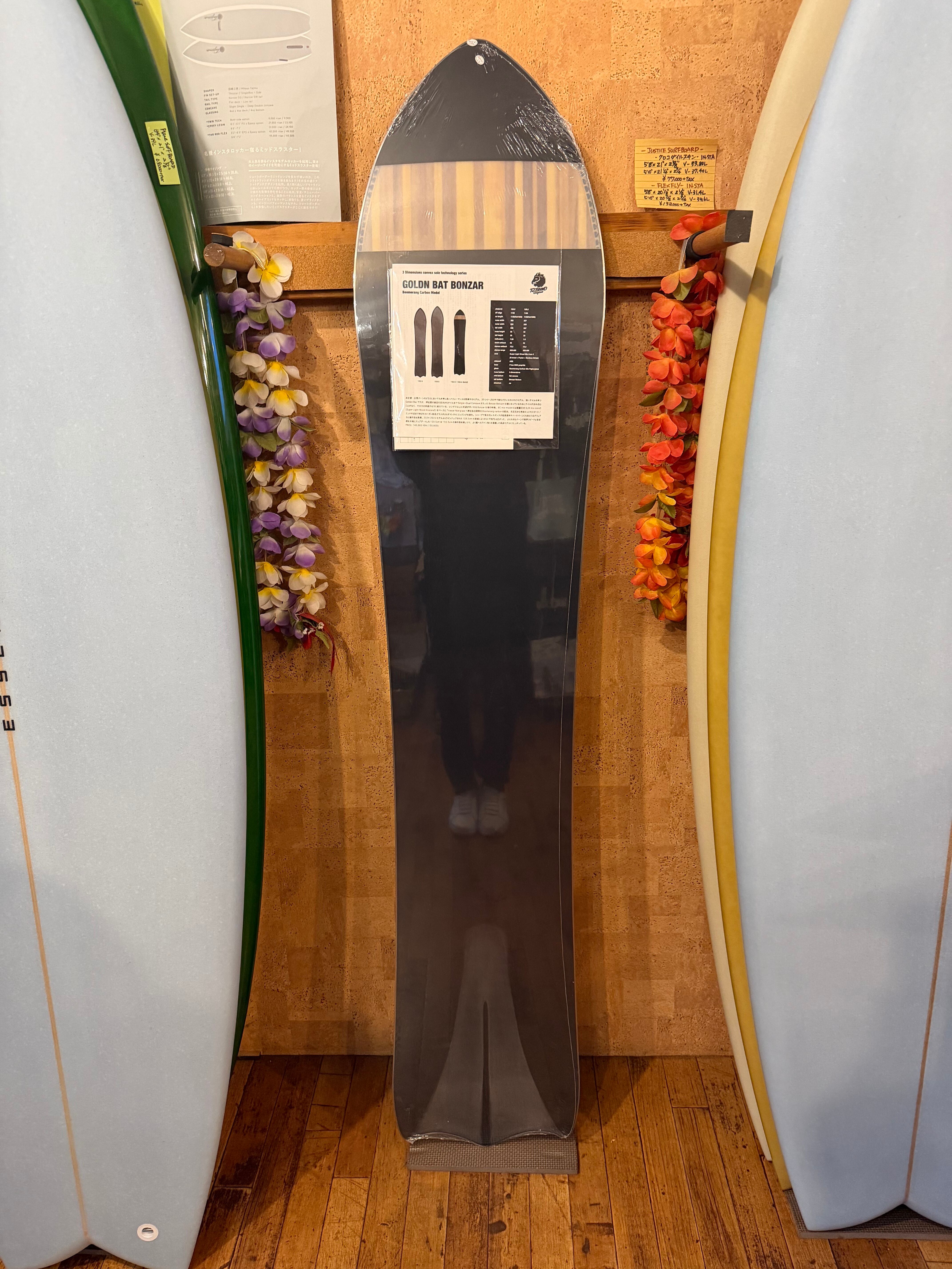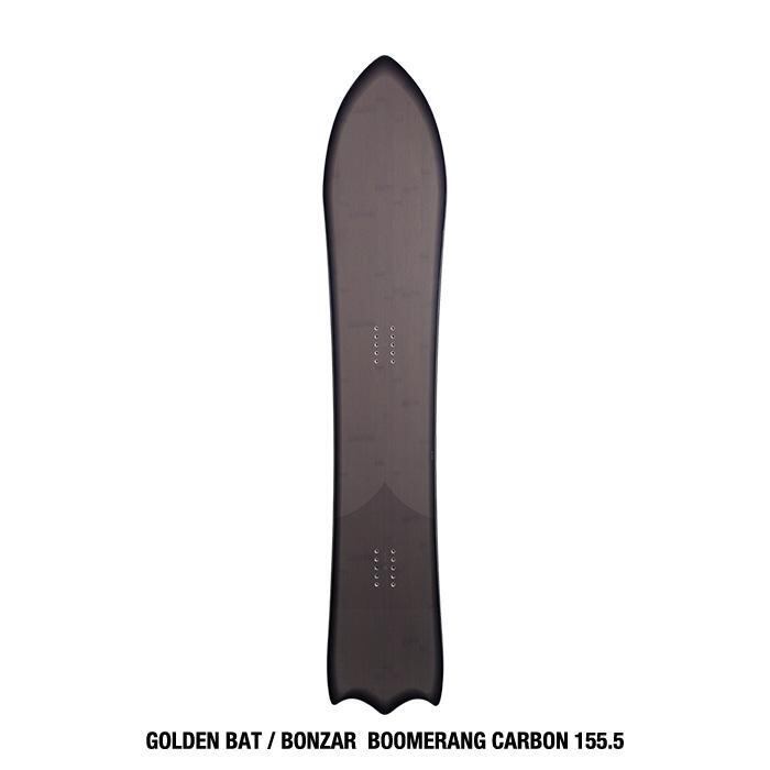 非圧雪・圧雪バーンのどちらにおいても非常に高いパフォーマンスを発揮するモデル。3Dシリーズの中で最もバランスのとれたモデル。短いテイルを持つGolden Batですが、滑走面の後足の足元からテイルまでSingle〜Dual Concaveが入ったBonzar Bottom仕様になっているためにテイルが沈み込むことがなく、その力を前進する力に変えている。レングス以上に初速が早いのはBonzar仕様の特徴。BC-mix modelには軽量芯材SLW mix core3(Super Light Wood mixcore3)をベースにTriaxial fiberglassへ弊社独自開発のBoomerang carbonを配合。両足元から有効エッジのスタート/エンド付近まで伸びたカーボン配合グラスがよりダイレクトにエッジングを強化。シャープで高次元レスポンスが超高速時やハードバーンにも耐えうるグリップ力と操作性を発揮。Bredren collab modelのウッドコアにも弊社独自開発となる新技術FTC-PD core2(Flex & Torsion control Punching Dot core2)を搭載。軽量芯材X-woodとPoplarから成るミックスコアにウエストを中心にドットホールをX状に貫通させ、フォームを埋め込みました。これによってもともとタフなフレックスときついトーションになりがちな3D構造のボードにウエスト周辺のフレックスや反応を低減させることで今までの3Dボードでは成し得なかったソフトなフレックスと緩いトーションをもたらせることに成功。また、Bonzar bottom周辺が3Dコアになっているために、今までテイルを緩くすることが実現できませんでしたが、同じくテイル付近にも多数の穴を開けフォームを注入することでテイルの抜けが非常にサーフライクかつナチュラルな乗り味を実現。どんな斜面でも高速で攻める時はBC mix model、あらゆる地形に合わせて気持ち良くスノーサーフィンを楽しむ時はBredren collab modelをお勧め。